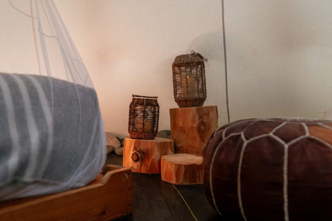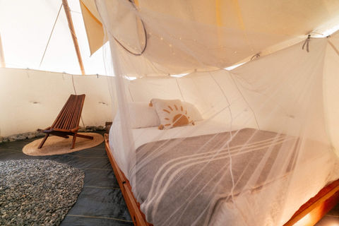 The teepees are an experience more so than just accommodations. You are still glamping in the outdoors but with the luxury of a king or double bed with a bug net, lounging space, and fire pit all within your teepee.